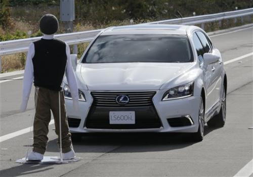 Toyota's Lexus LS stops automatically in front of a dummy during a Toyota Motor Corp. demonstration of the pre-collision system (PCS) at its Higashi-Fuji Technical Center in Susono, southwest of Tokyo, Monday, Nov. 12, 2012. The PCS, one of the automaker's pedestrian accident countermeasures, watches out for pedestrians to avoid collisions with them. (AP Photo/Koji Sasahara) Toyota Motor Corp. is testing car safety systems that allow vehicles to communicate with each other and with the roads they are on in a just completed facility in Japan the size of three baseball stadiums.