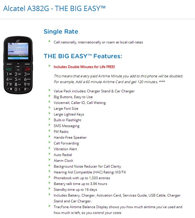 - SIMILAR to SeniorMobile: Alcatel A382G ($40 phone)- probably "locked" to Tracfone- below; $20 prepaid (120 minutes; 90 days)